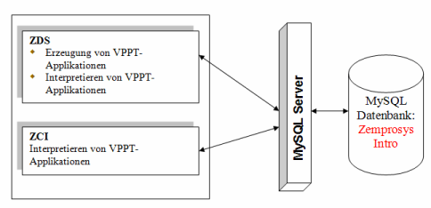 - Standardmäßig bietet MySQL zahlreiche Anwendungsmöglichkeiten, so z.B. eine sichere und vereinfachte Netzwerkfunktionalität. Somit kann Zemprosys als Frontend-System eingesetzt werden, um die in einer MySQL-Datenbank gespeicherten VPPT-Applikationen mit Hilfe von SQL-Anweisungen aufzurufen und auszuführen.